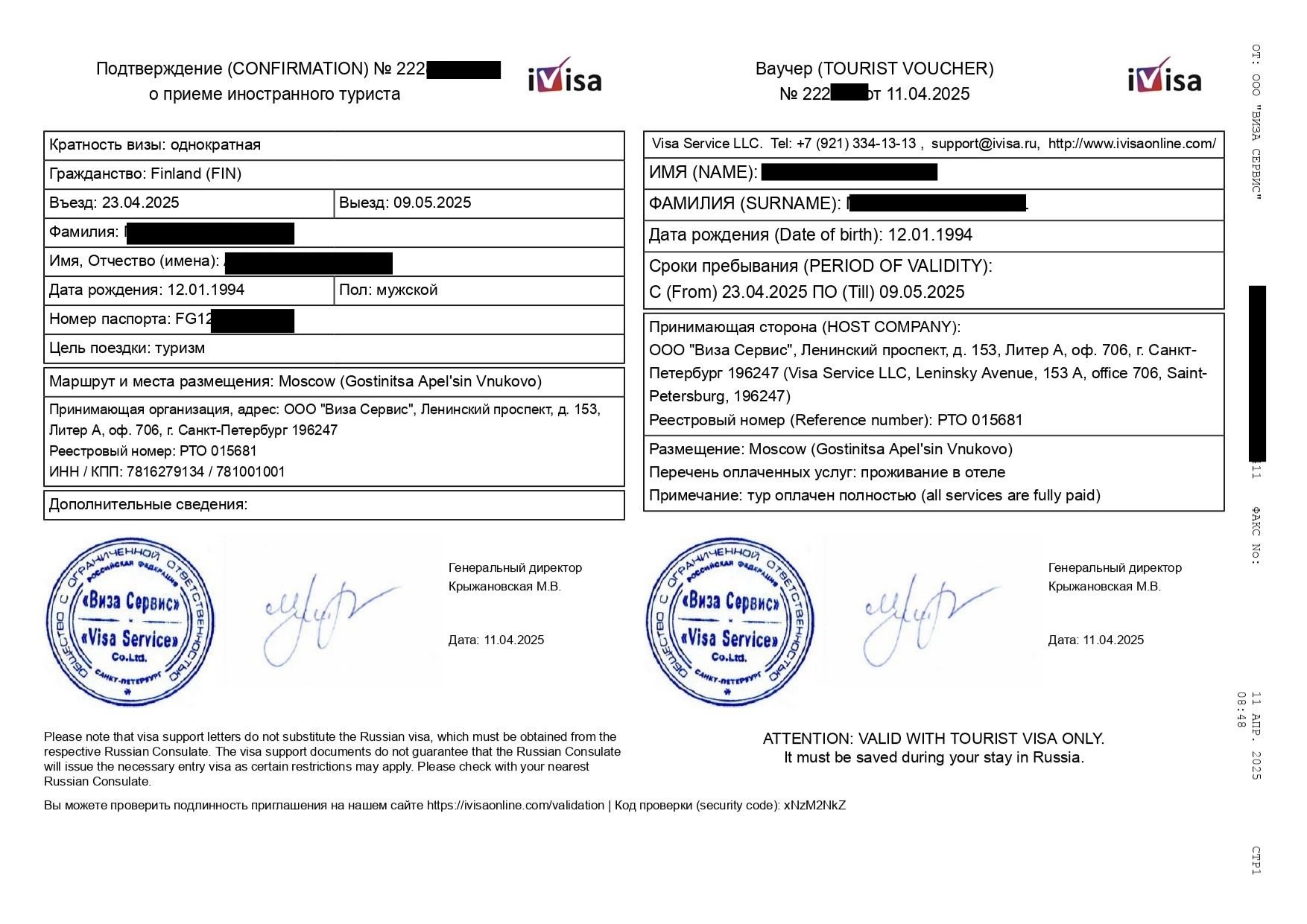 C'est un document de voyage qui justifie votre séjour et porte le numéro de référence de l'agence touristique russe confirmant l'accueil du touriste étranger. Ce document est essentiel pour faire votre demande de visa au consulat. Notez que les réservations Airbnb ne fournissent pas d'invitations. Quelle que soit la durée de votre séjour (jusqu'à 30 jours pour un visa touristique), le bon Russie fourni par notre agence couvre toute la période de votre séjour, sans besoin de réservation d'hôtel ou de certificat d'hébergement. Depuis 2021, il peut être valable jusqu'à 180 jours avec entrées multiples. Vous pouvez demander une invitation touristique valable de 1 à 180 jours, avec entrée simple, double ou multiple.